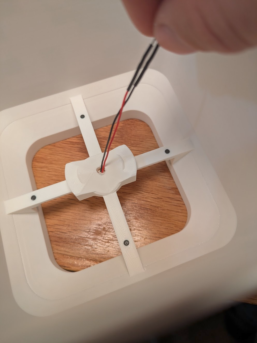 Thread the gripper's JST connector and fishing swivel up through the gantry's center hole. Attatch a 10mm keyring to the gripper's fishing swivel. this prevents it from falling back through the hole. This is yet another one of those situations where it's better to have cross locking tweezers for hands.