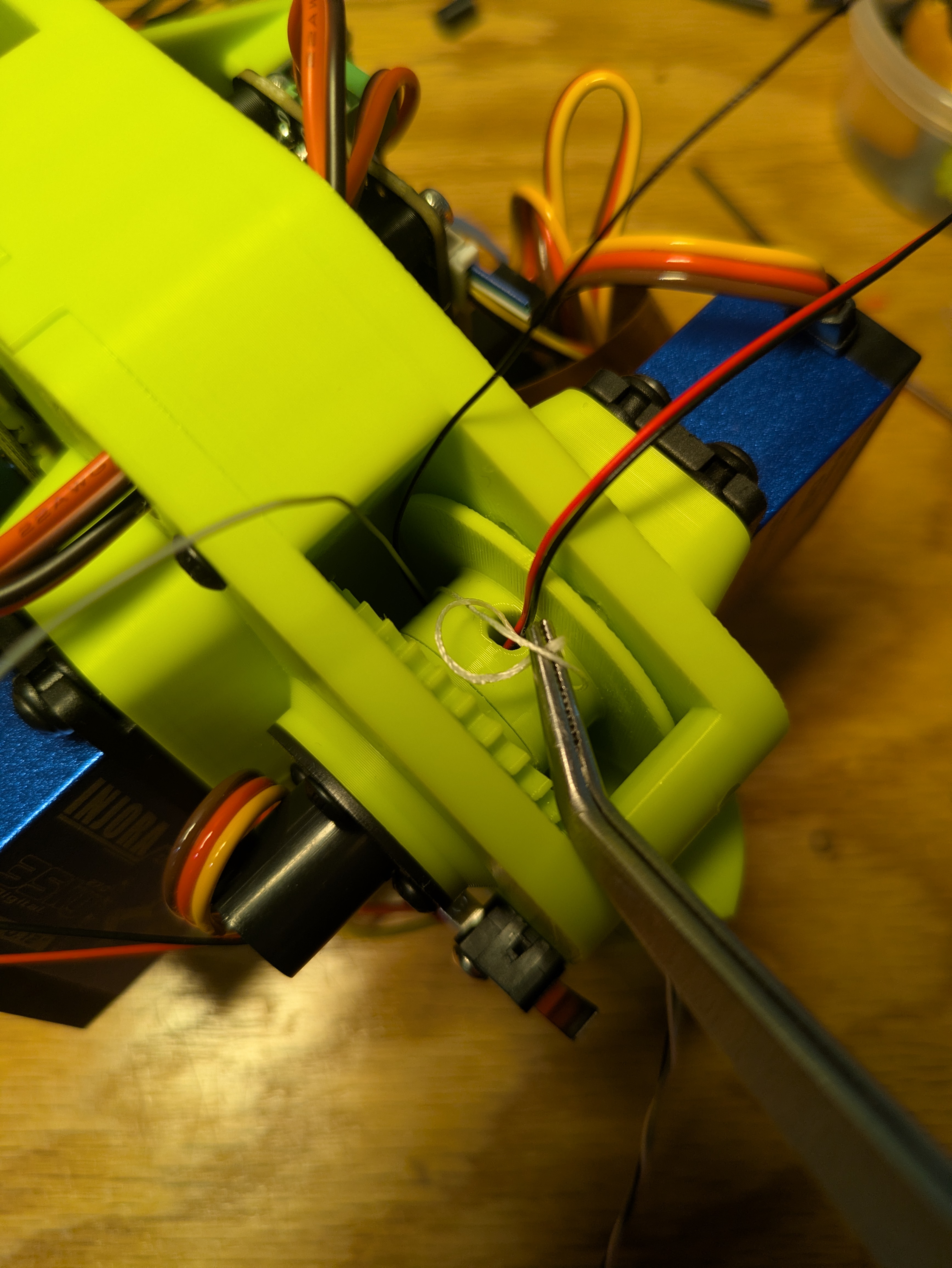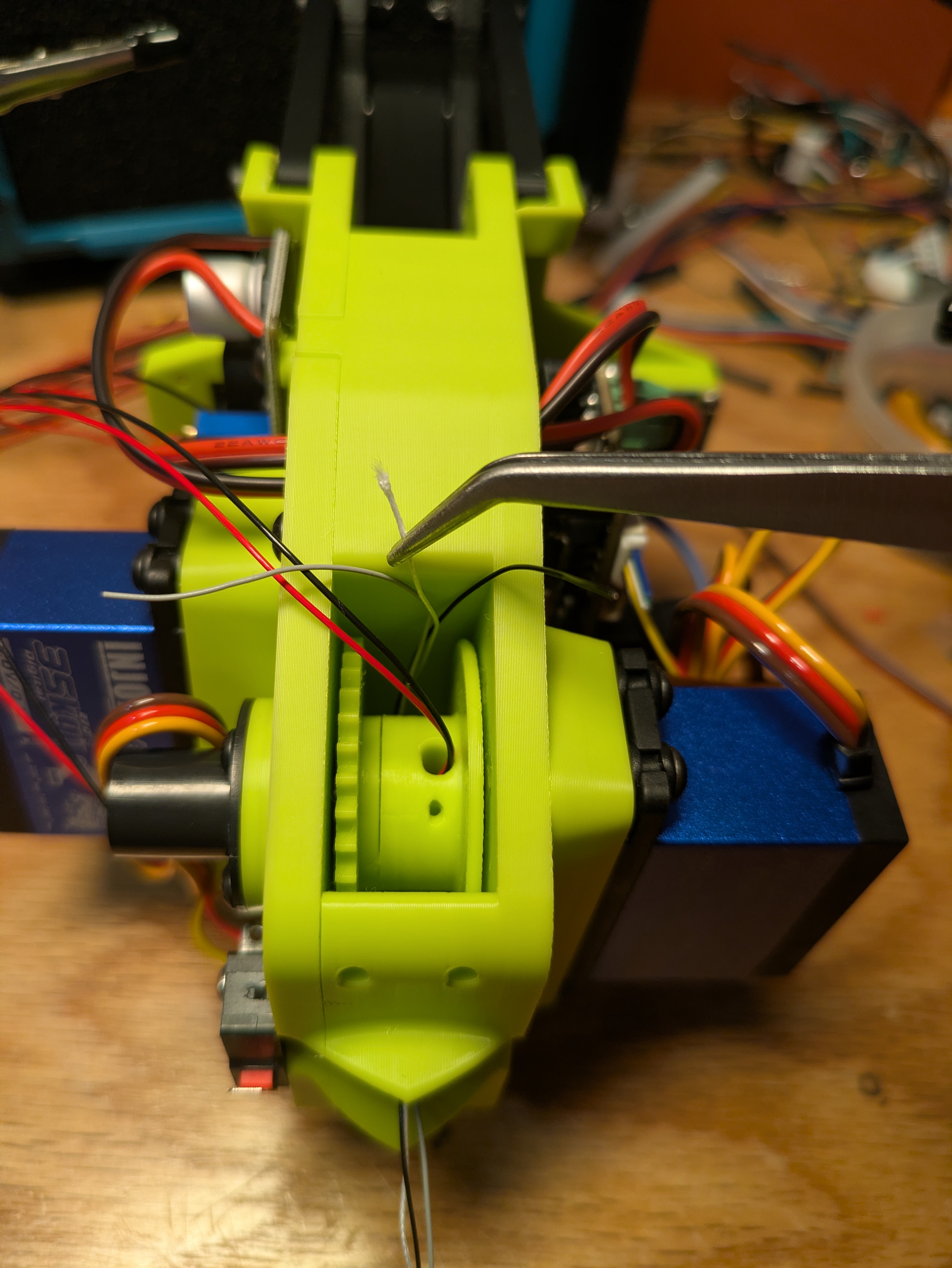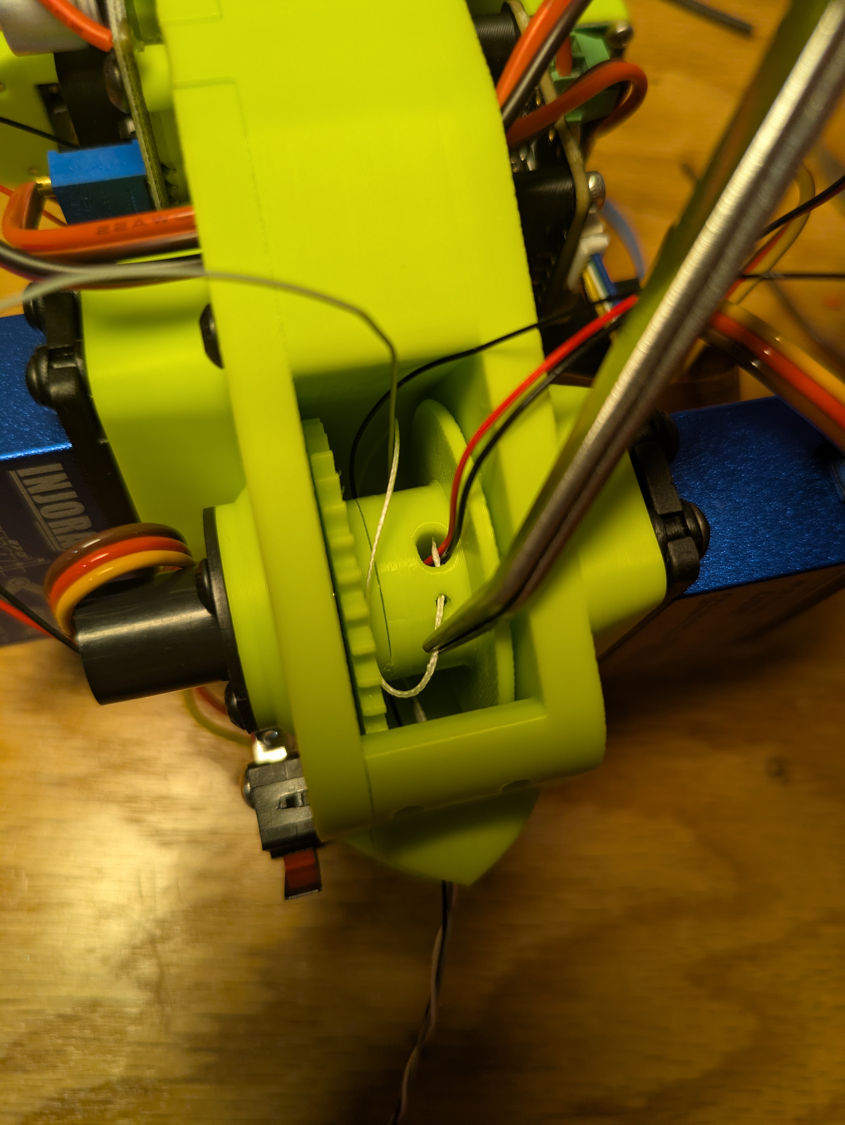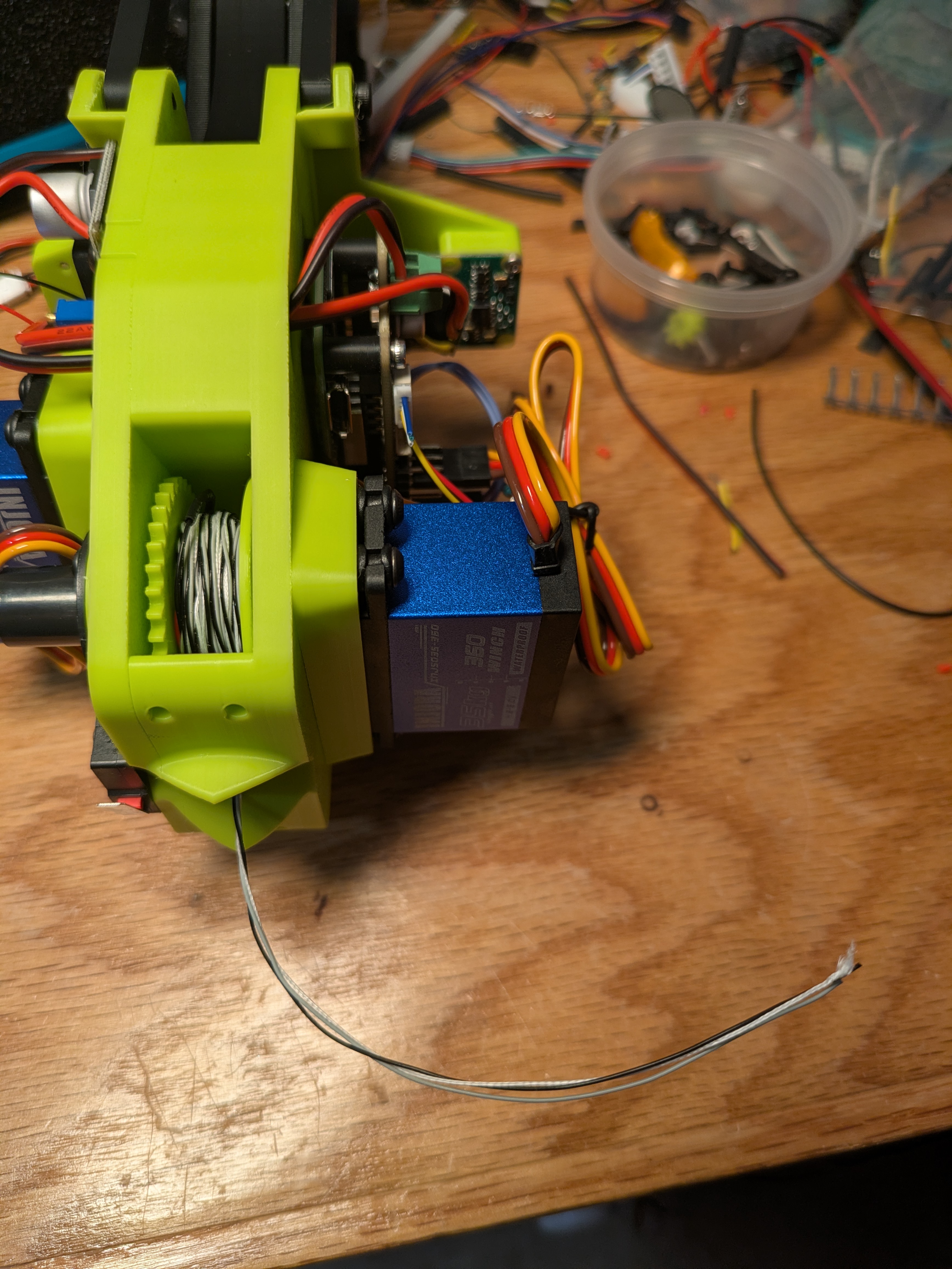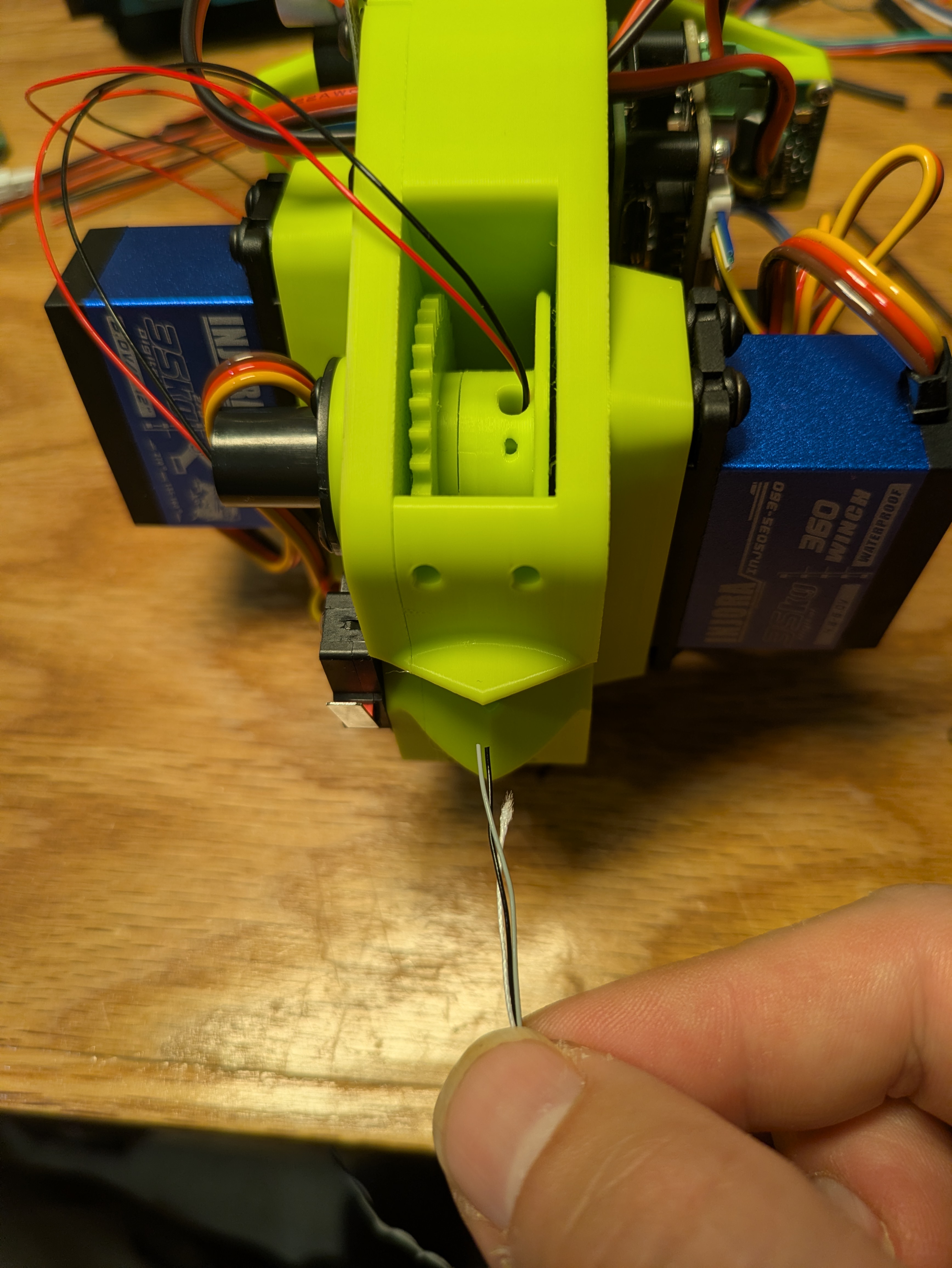 Pull the line tight out of the top of the gripper. plug in the winch servo to a servo tester and use it to carefully wind your two meters of power line onto the spool.