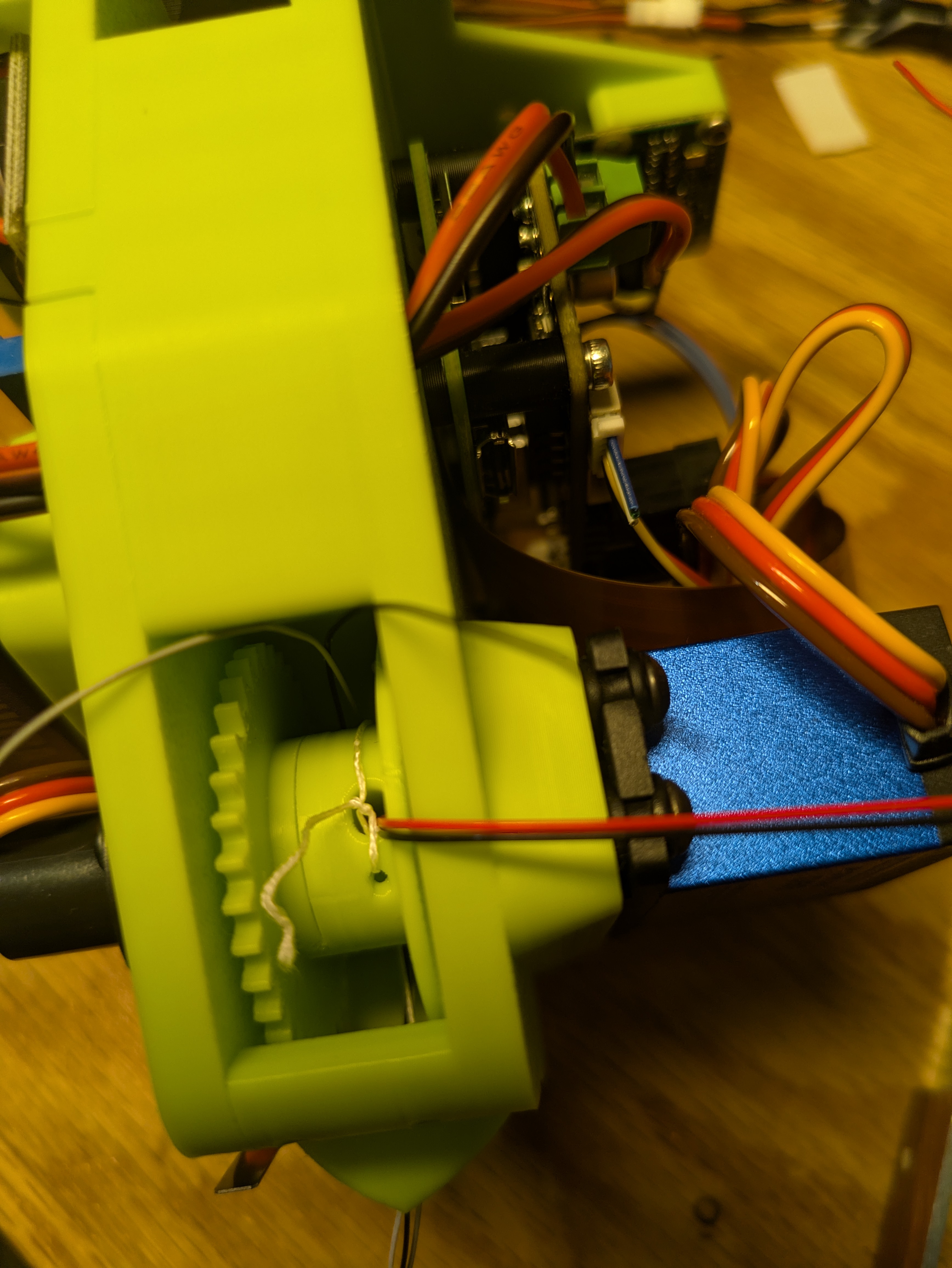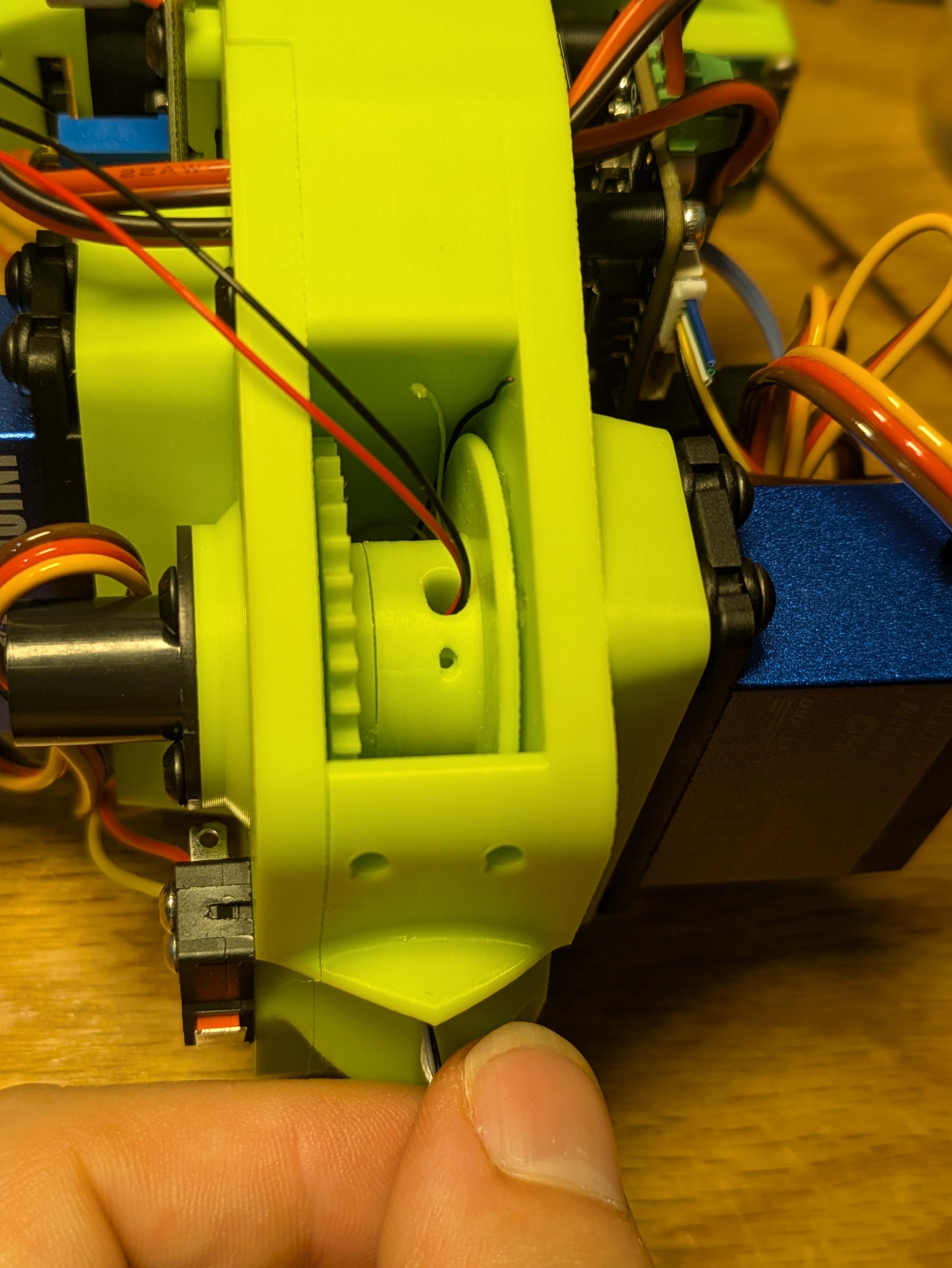 Mount this onto the mechanism lid with two M3x4 screws. Output side towards the outside of the gripper. Feed all the wires through the nearby hole to the other side.