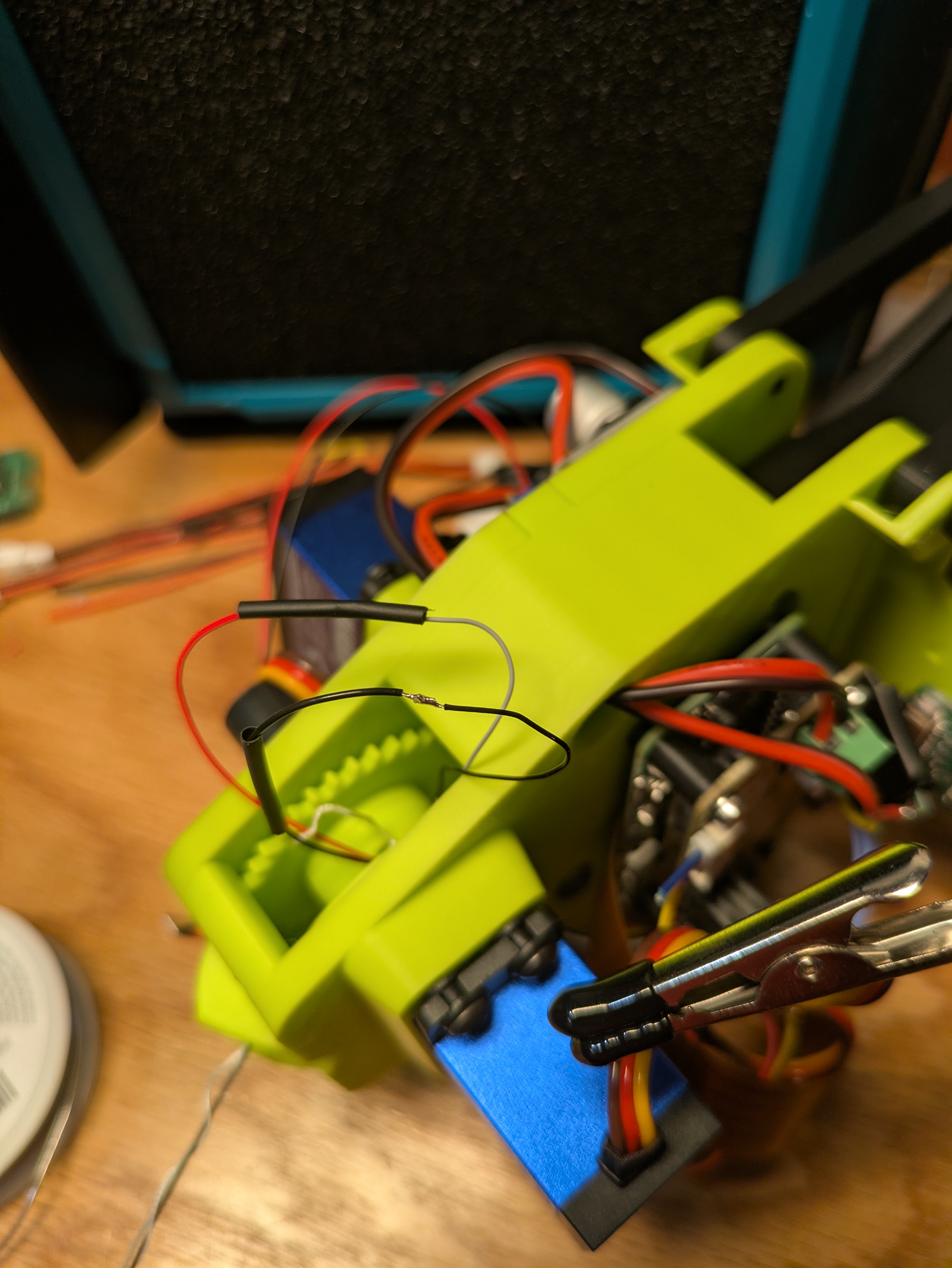 Flip the gripper over and position it so that the two 28 awg red and black wires that we fed through the hole before are in reach of your helping hands and soldering iron.