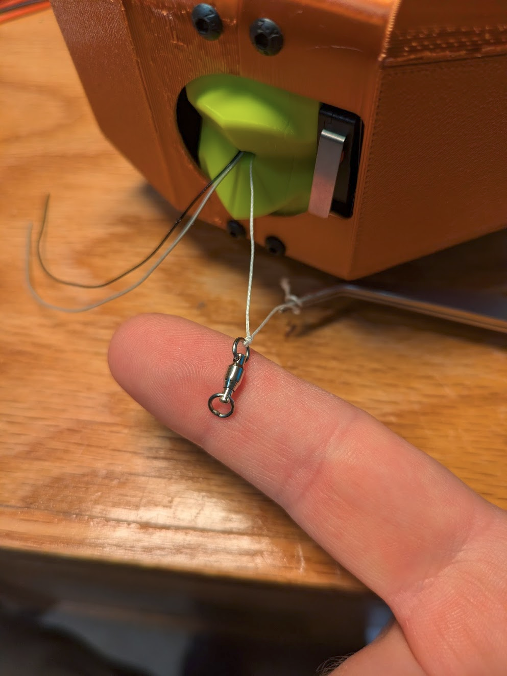 Since the fishing line is now shorter than the wires, it will bear the weight even if all the line is unwound, protecting the wire splices from stress. but if the loop of wire is too long, it may not stay buried under the windings, and this can cause it to get stuck in the gear so it needs to be short. If you can't make it short at least tape it down.
