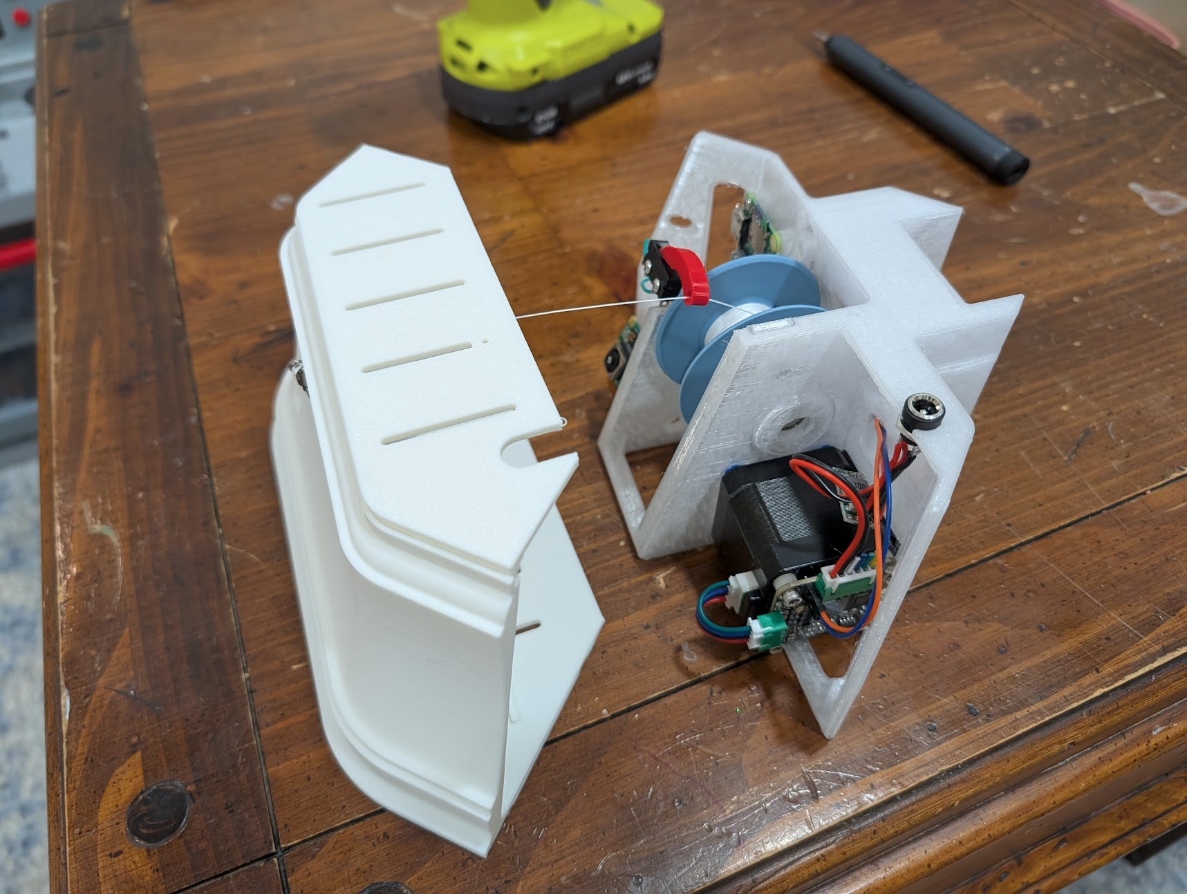 Pull out enough of the line that you can reach it from the ground. If you feel bumping while pulling out line, this is normal. It is an electrical phenomenon involving the stepper driver, and it is harmless. When pulling line, confirm that the switch clicks when it's tight, and unclicks when it's loose. If you don't hear the click, especially with the power line, you may have to open the cover an slightly bend the lever arm of the switch up or down by small increments.
