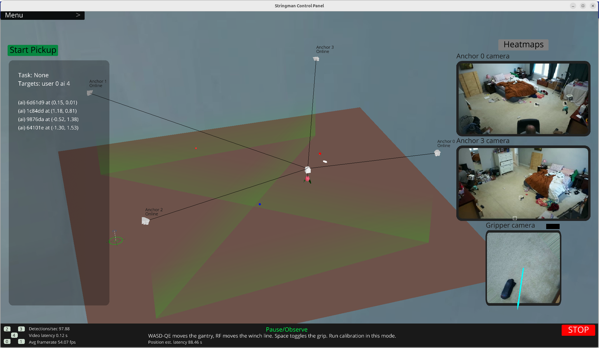 Following the instructions in the Desktop Setup Guide start up the Stringman controller and wait for all robot components to be discovered and connected. Confirm you see the video feeds and every anchor says "Connected" above it. If you didn't connect power to the gripper, that's fine it will be discovered after tie up.